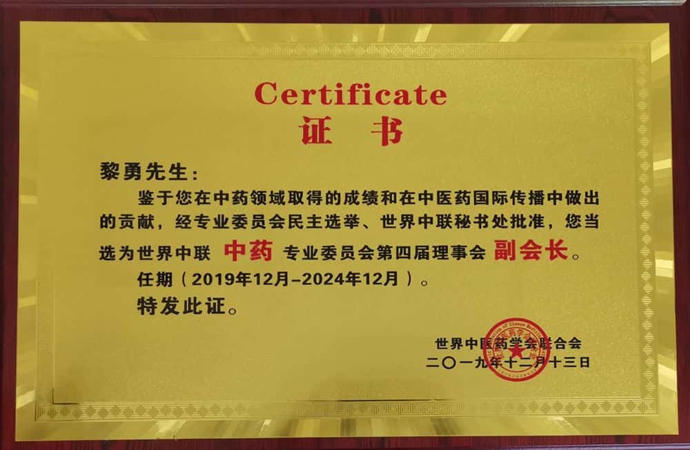 黎勇先生当选为世界中联中药专业委员会第四届理事会副会长